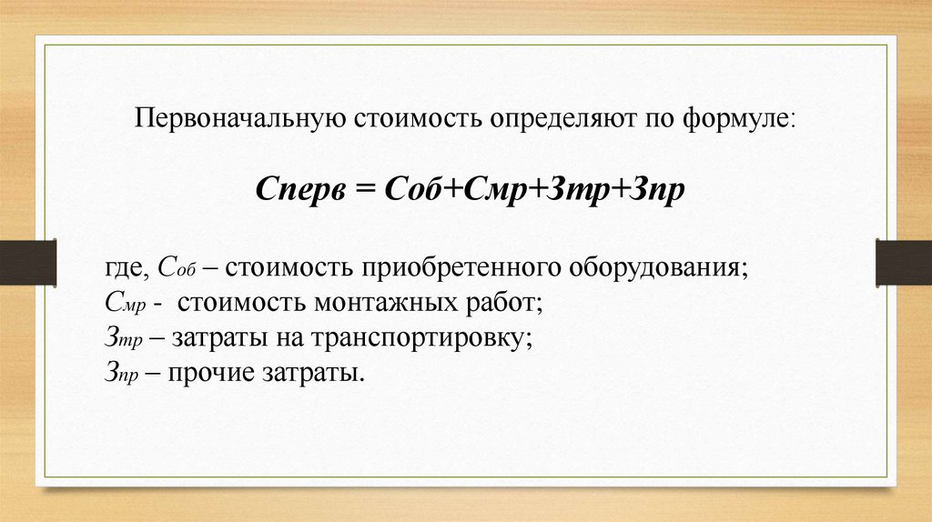 Первоначальную стоимость определяют по формуле:Сперв = Соб+Смр+Зтр+Зпр
