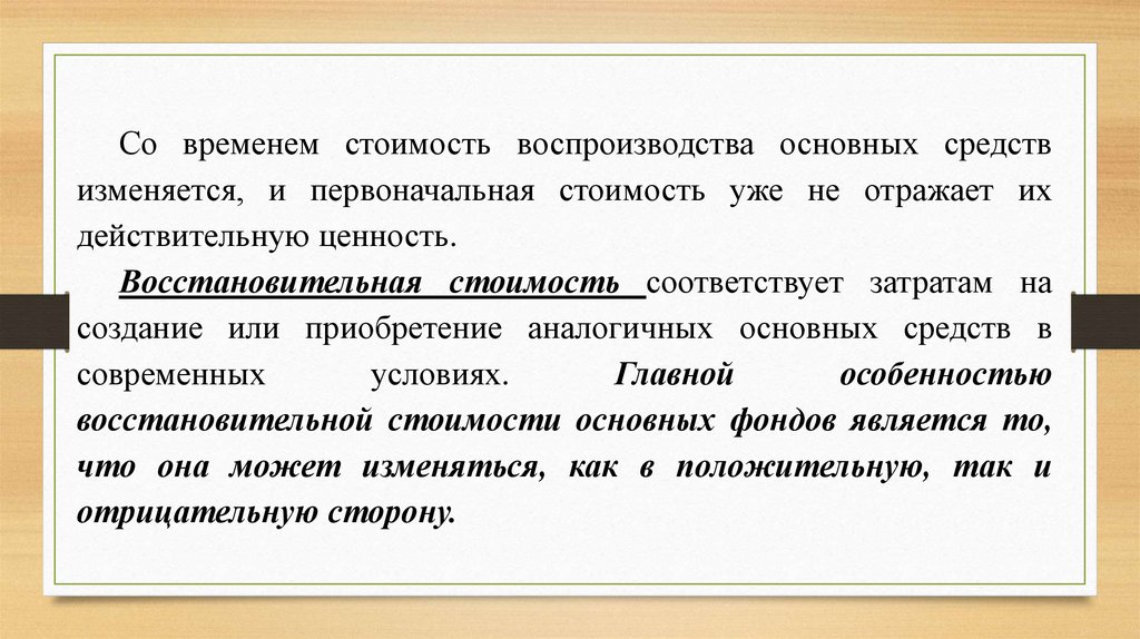 Со временем стоимость воспроизводства основных средствизменяется, и первоначальная стоимость уже не отражает их