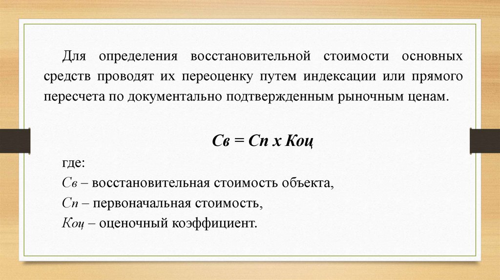 Для определения восстановительной стоимости основныхсредств проводят их переоценку путем индексации или прямого