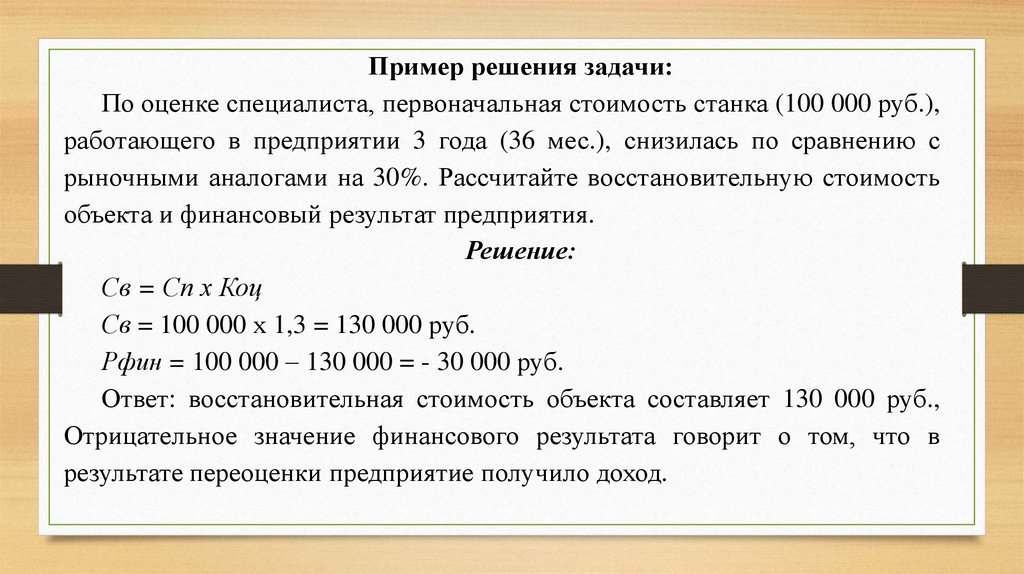 Пример решения задачи:По оценке специалиста, первоначальная стоимость станка (100 000 руб.),