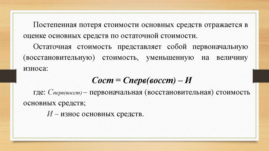 Постепенная потеря стоимости основных средств отражается воценке основных средств по остаточной стоимости.