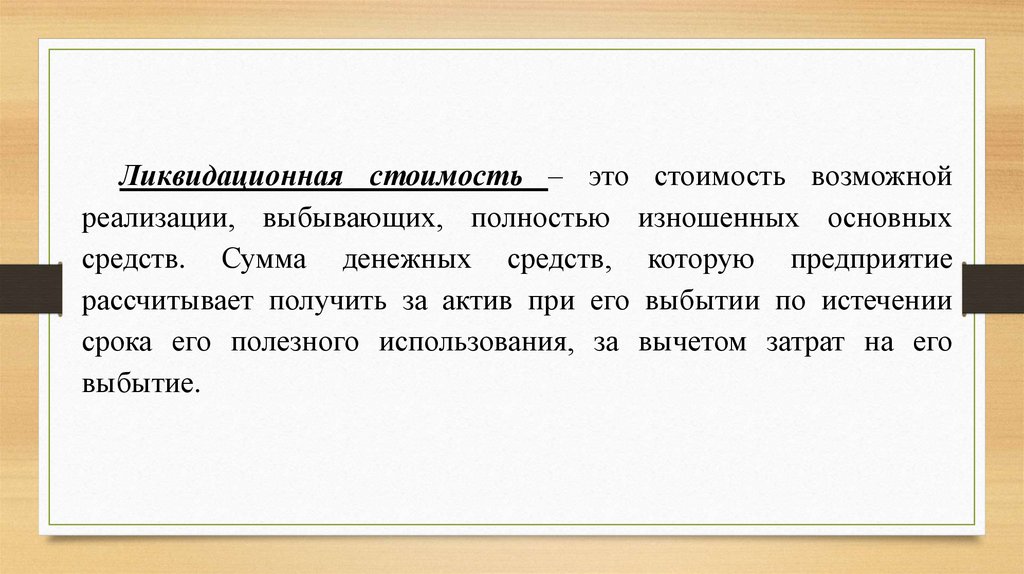 Ликвидационная стоимость – это стоимость возможнойреализации, выбывающих, полностью изношенных основных