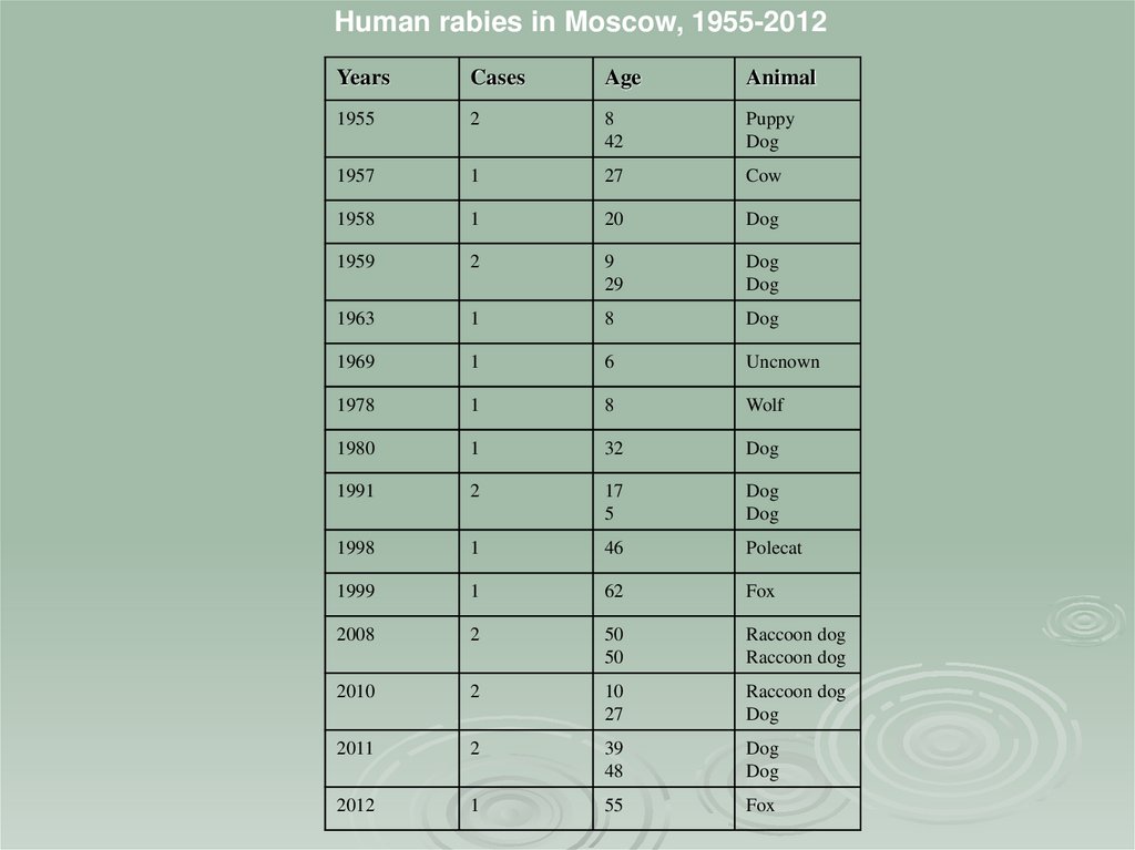 Не менее 5 случаев заболевания людей бешенствомпосле пересадки трупной роговицы в ХХ веке.