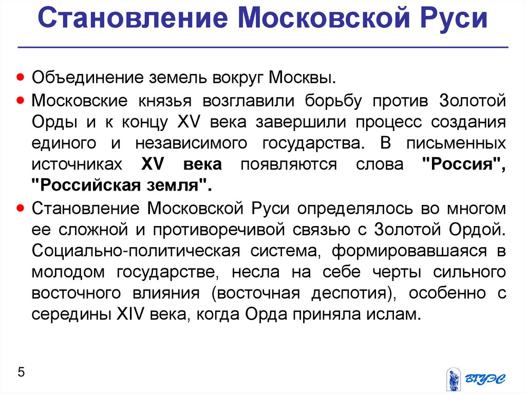 Становление Московской Руси определялось во многом