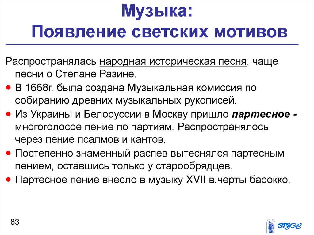 Партесное пение внесло в музыку XVII в.черты барокко.