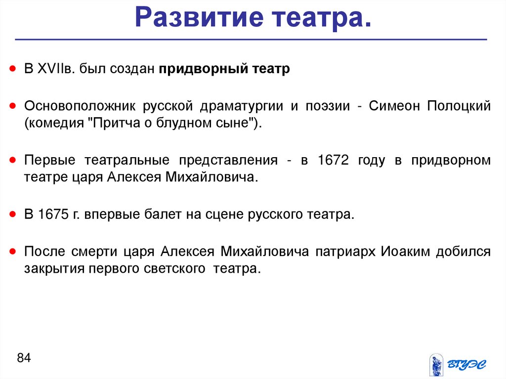 Развитие театра.В ХVIIв. был создан придворный театр