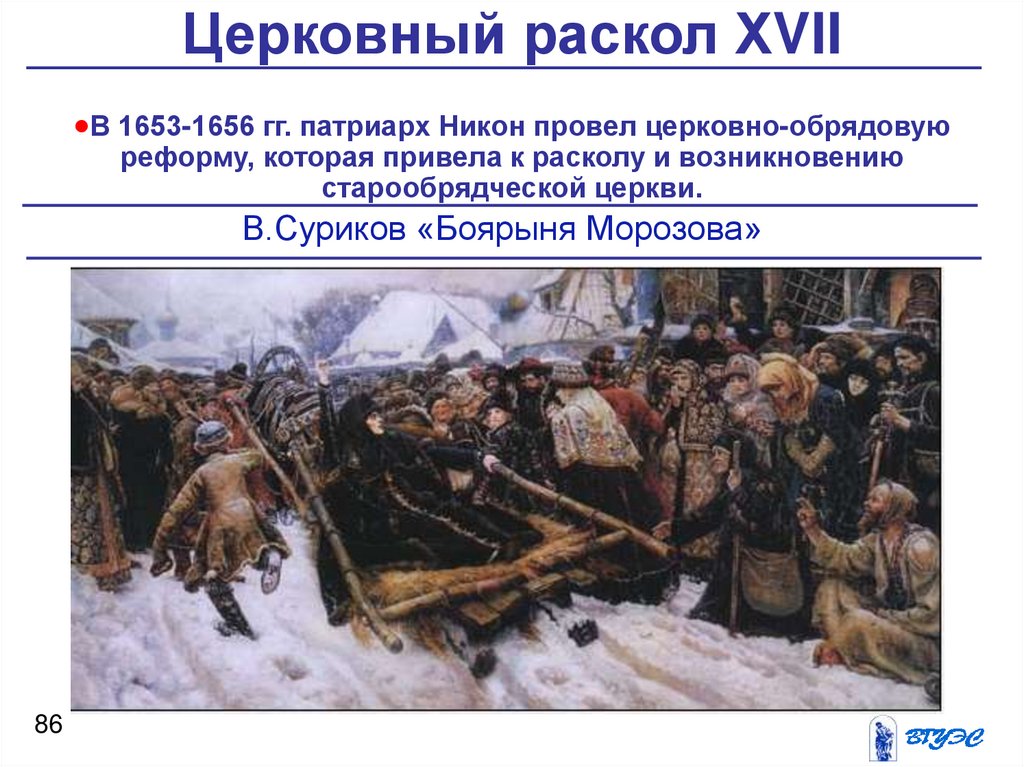 Церковный раскол ХVIIВ 1653-1656 гг. патриарх Никон провел церковно-обрядовую