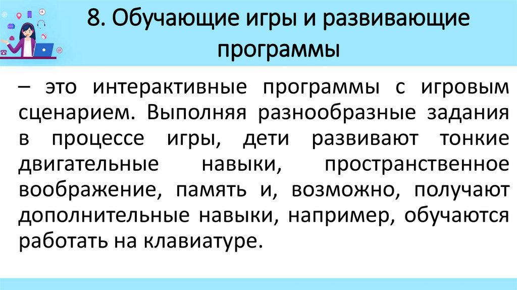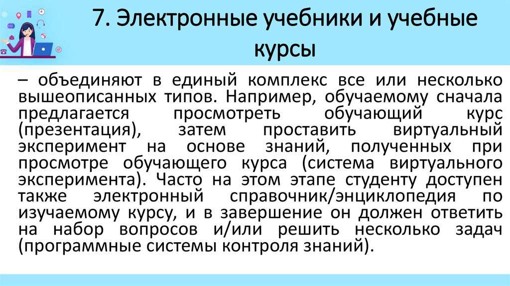9. Восемь типов компьютерных средств, используемых в обучении на основании их функционального назначения:
