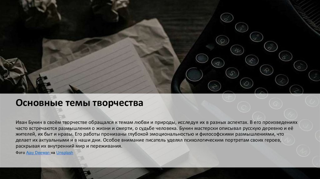 Основные темы творчестваИван Бунин в своём творчестве обращался к темам любви и природы, исследуя их в разных аспектах. В его произведениях