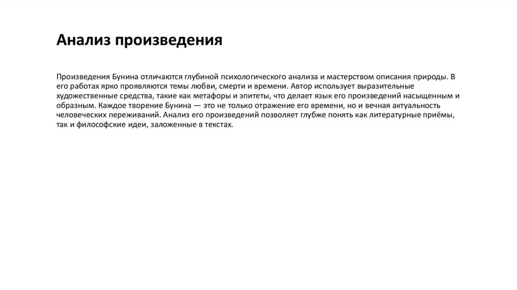 Анализ произведенияПроизведения Бунина отличаются глубиной психологического анализа и мастерством описания природы. В