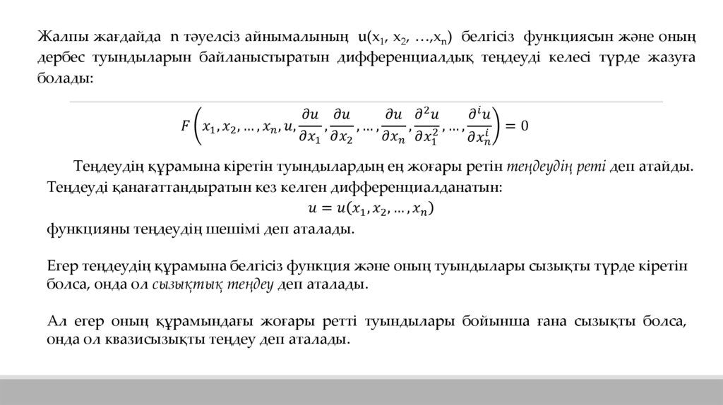 Жалпы жағдайда n тәуелсіз айнымалының u(x1, x2, …,xn) белгісіз функциясын және оның