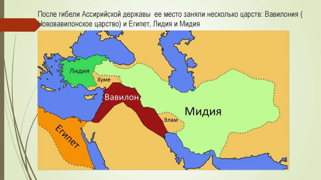 После гибели Ассирийской державы ее место заняли несколько царств: Вавилония (Нововавилонское царство) и Египет, Лидия и Мидия