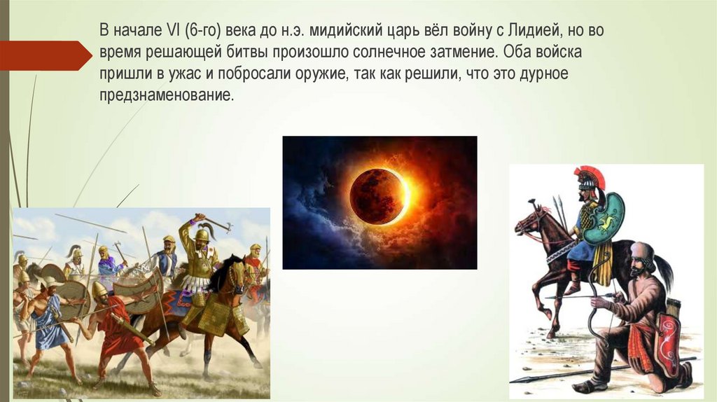 В начале VI (6-го) века до н.э. мидийский царь вёл войну с Лидией, но вовремя решающей битвы произошло солнечное затмение. Оба войска