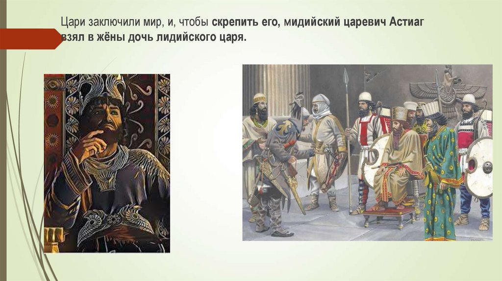 Цари заключили мир, и, чтобы скрепить его, мидийский царевич Астиагвзял в жёны дочь лидийского царя.