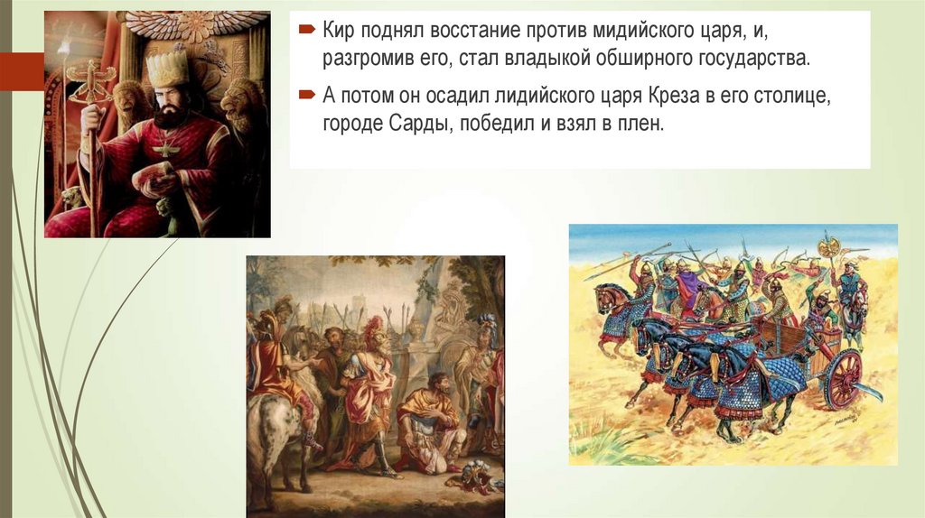 Кир поднял восстание против мидийского царя, и,разгромив его, стал владыкой обширного государства.