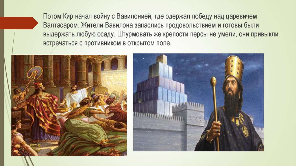 Потом Кир начал войну с Вавилонией, где одержал победу над царевичемВалтасаром. Жители Вавилона запаслись продовольствием и готовы были