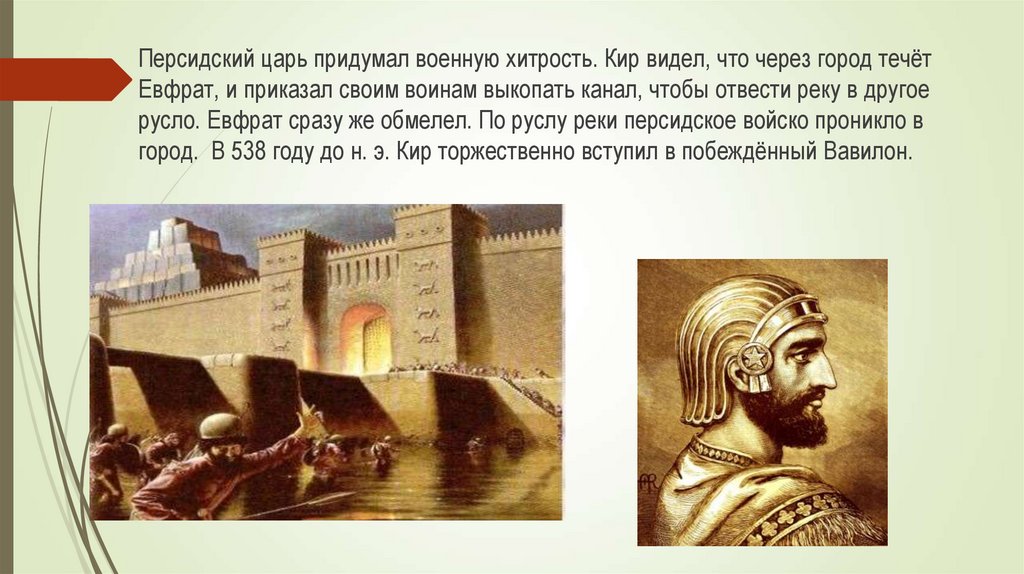 Персидский царь придумал военную хитрость. Кир видел, что через город течётЕвфрат, и приказал своим воинам выкопать канал, чтобы отвести реку в другое
