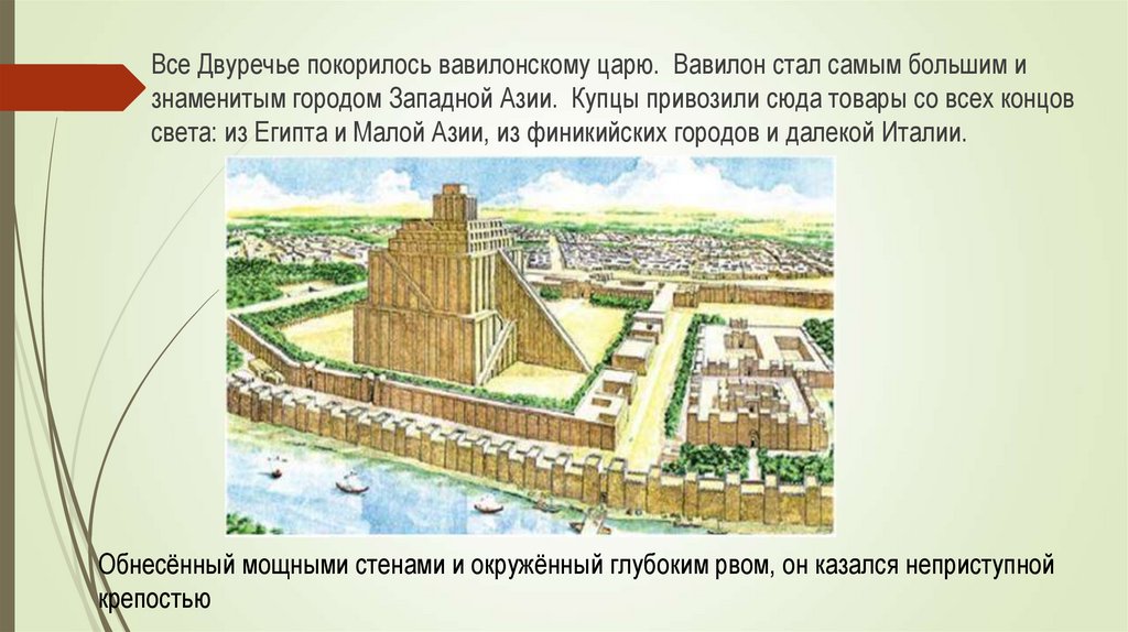 Все Двуречье покорилось вавилонскому царю. Вавилон стал самым большим изнаменитым городом Западной Азии. Купцы привозили сюда товары со всех концов