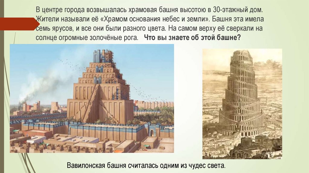 В центре города возвышалась храмовая башня высотою в 30-этажный дом.Жители называли её «Храмом основания небес и земли». Башня эта имела