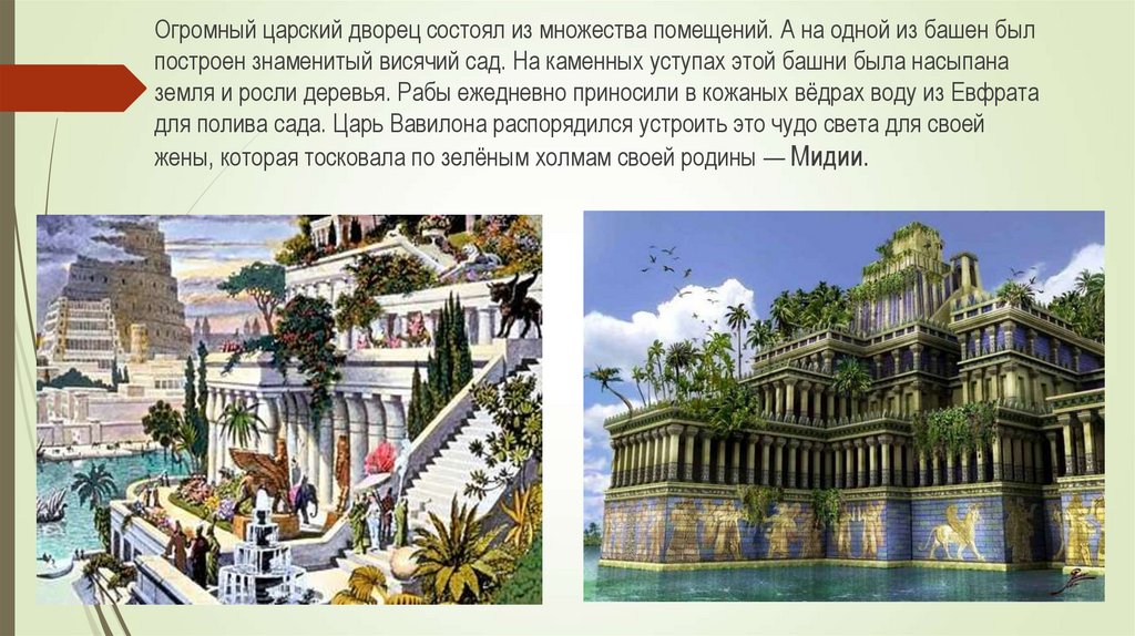 Огромный царский дворец состоял из множества помещений. А на одной из башен былпостроен знаменитый висячий сад. На каменных уступах этой башни была насыпана