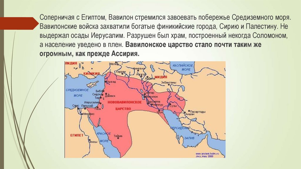 Соперничая с Египтом, Вавилон стремился завоевать побережье Средиземного моря.Вавилонские войска захватили богатые финикийские города, Сирию и Палестину. Не