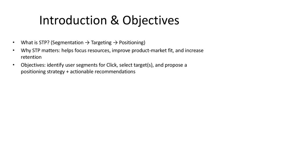 Introduction & ObjectivesWhat is STP? (Segmentation → Targeting → Positioning)