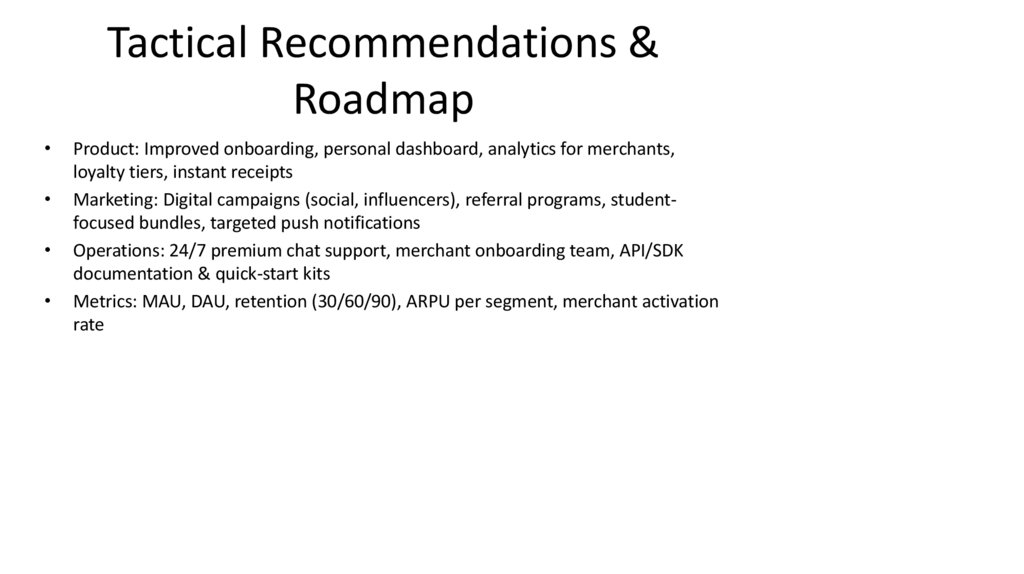 Metrics: MAU, DAU, retention (30/60/90), ARPU per segment, merchant activation
