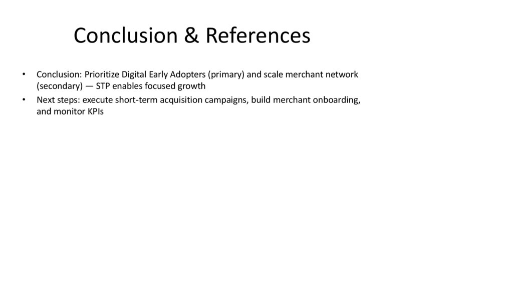 Conclusion & ReferencesConclusion: Prioritize Digital Early Adopters (primary) and scale merchant network