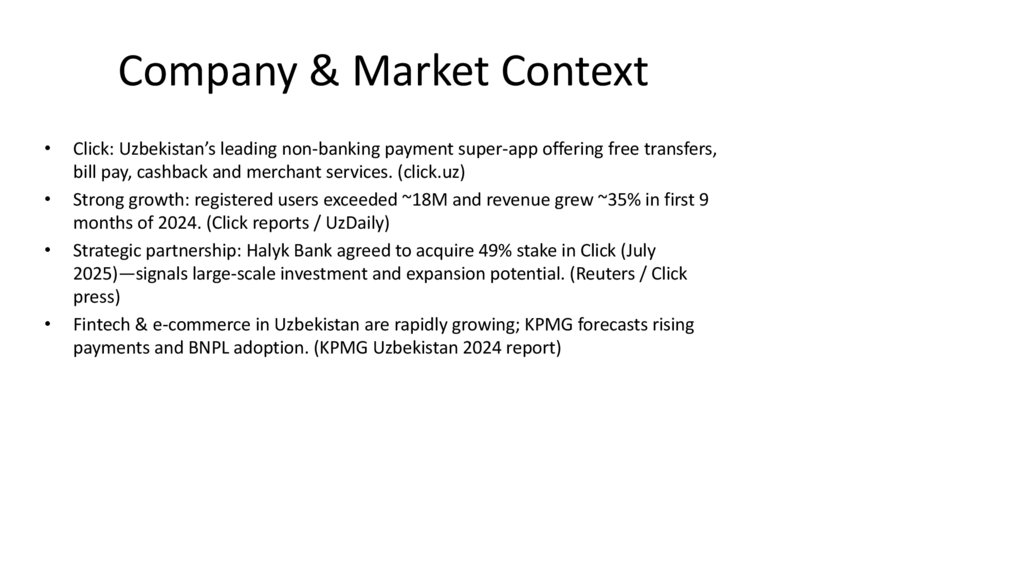 Company & Market ContextClick: Uzbekistan’s leading non-banking payment super-app offering free transfers,