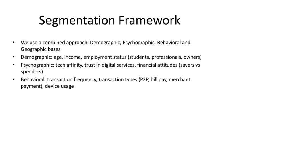 Segmentation FrameworkWe use a combined approach: Demographic, Psychographic, Behavioral and