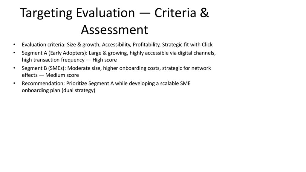 Evaluation criteria: Size & growth, Accessibility, Profitability, Strategic fit with Click