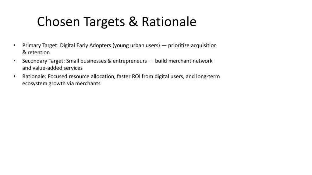 Chosen Targets & RationalePrimary Target: Digital Early Adopters (young urban users) — prioritize acquisition