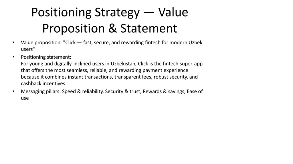 Value proposition: "Click — fast, secure, and rewarding fintech for modern Uzbek