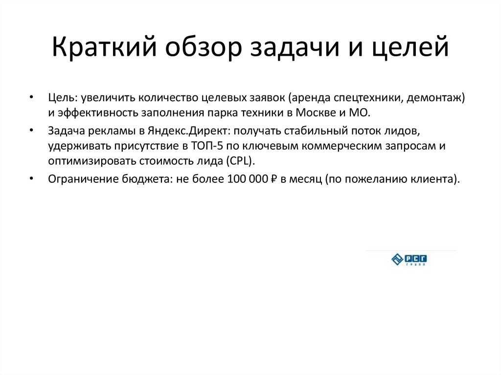 Краткий обзор задачи и целейЦель: увеличить количество целевых заявок (аренда спецтехники, демонтаж)