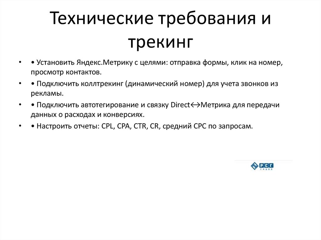 • Настроить отчеты: CPL, CPA, CTR, CR, средний CPC по запросам.