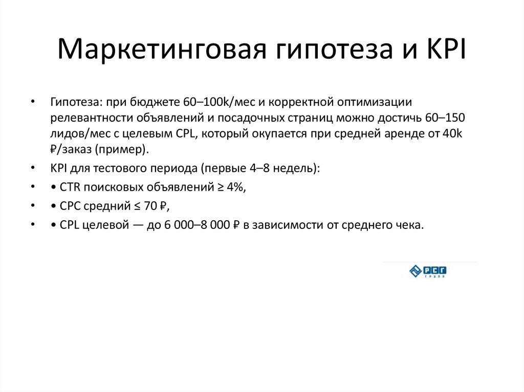 Маркетинговая гипотеза и KPIГипотеза: при бюджете 60–100k/мес и корректной оптимизации