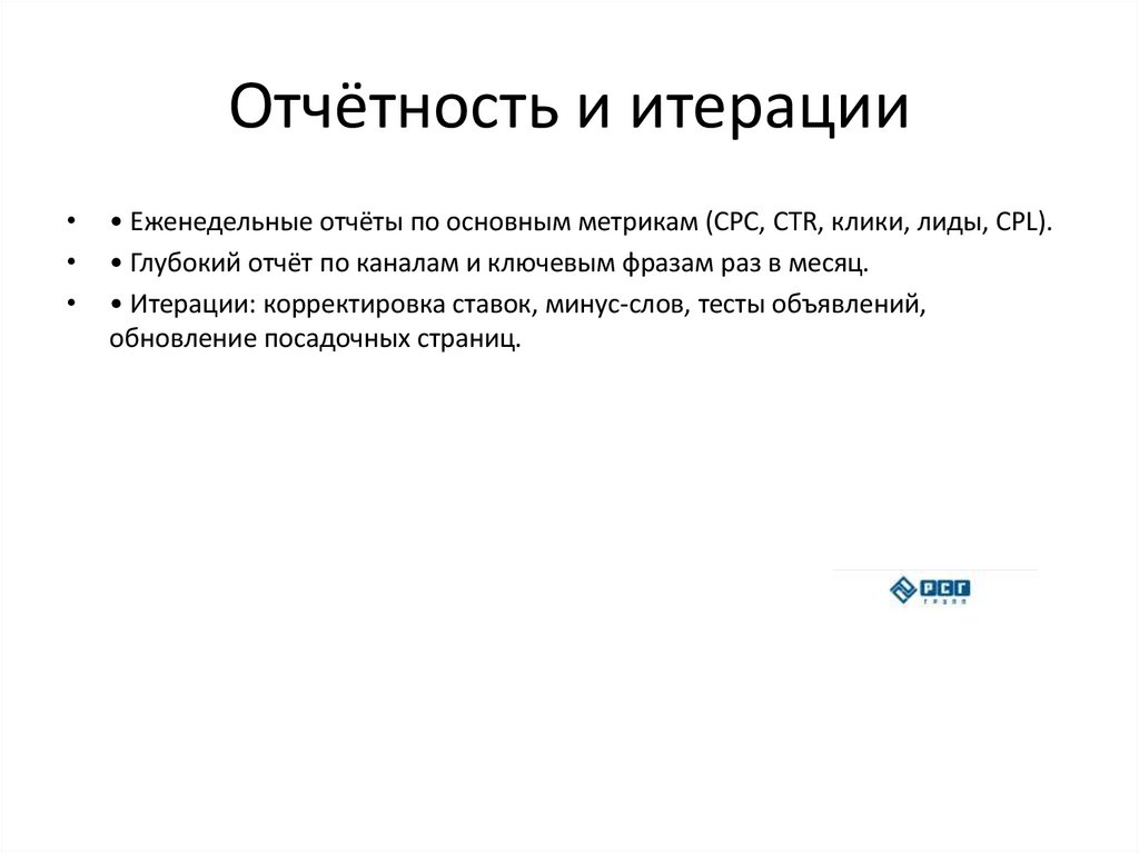 • Глубокий отчёт по каналам и ключевым фразам раз в месяц.