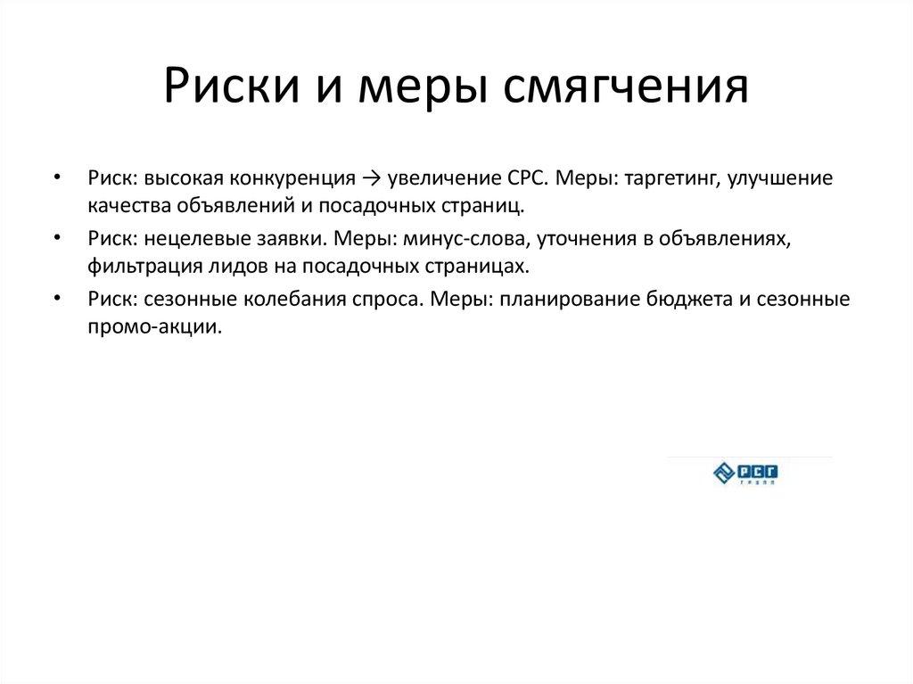 Риски и меры смягченияРиск: высокая конкуренция → увеличение CPC. Меры: таргетинг, улучшение