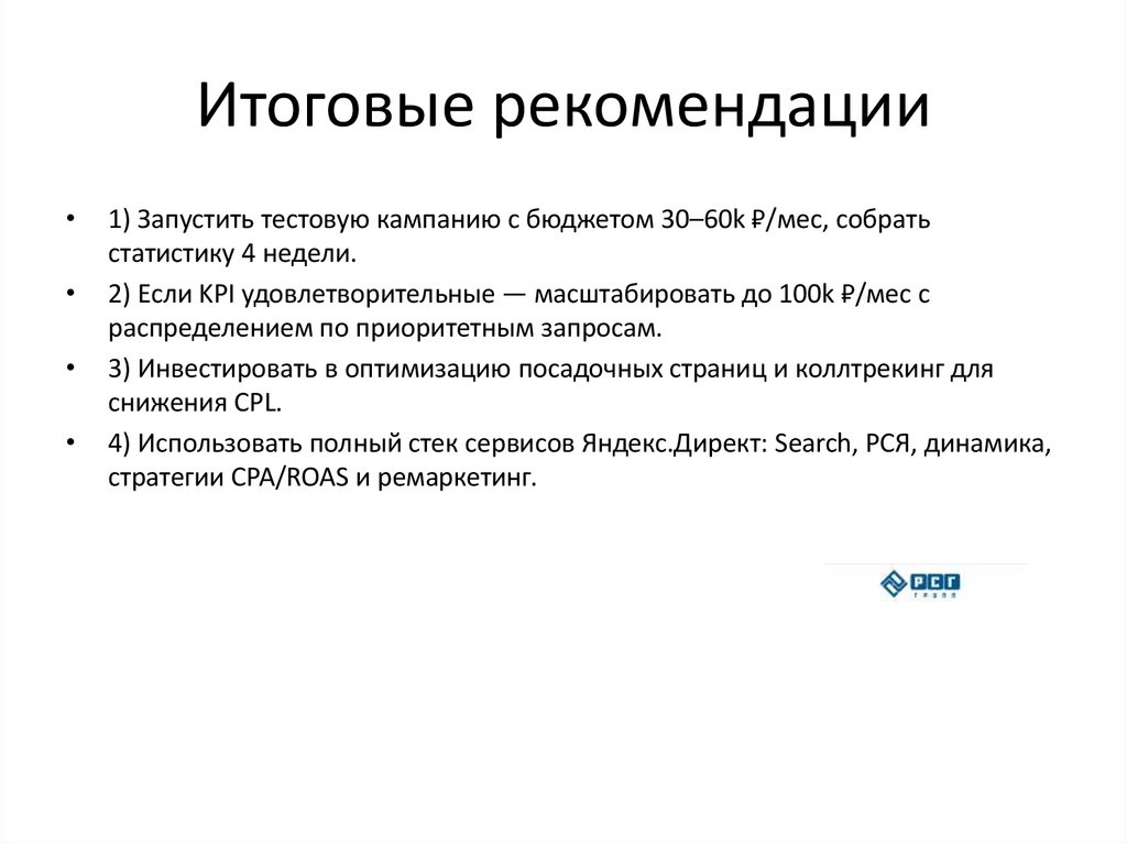 Итоговые рекомендации1) Запустить тестовую кампанию с бюджетом 30–60k ₽/мес, собрать