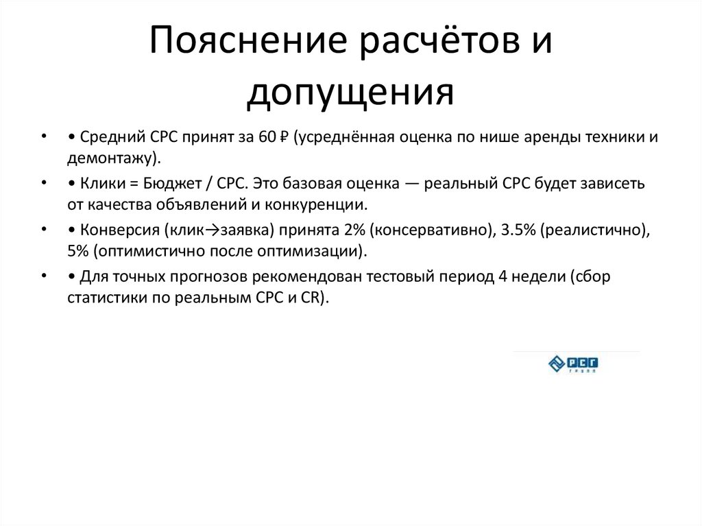 • Средний CPC принят за 60 ₽ (усреднённая оценка по нише аренды техники и