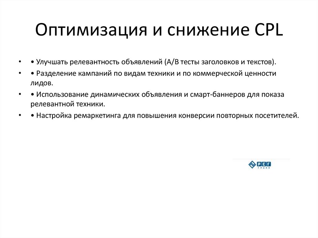 Оптимизация и снижение CPL• Улучшать релевантность объявлений (A/B тесты заголовков и текстов).