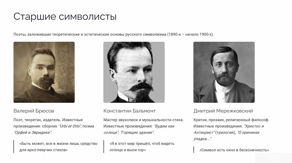 Старшие символистыПоэты, заложившие теоретические и эстетические основы русского символизма (1890-е – начало 1900-х).