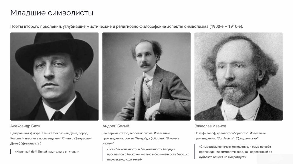 Младшие символистыПоэты второго поколения, углубившие мистические и религиозно-философские аспекты символизма (1900-е – 1910-е).