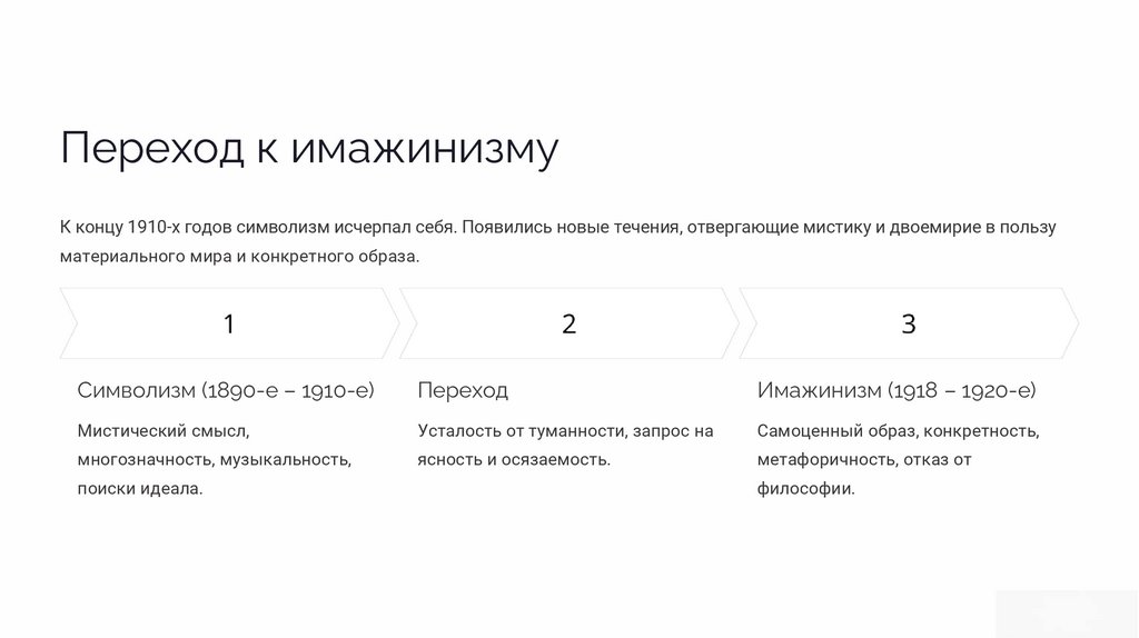 Переход к имажинизмуК концу 1910-х годов символизм исчерпал себя. Появились новые течения, отвергающие мистику и двоемирие в пользу