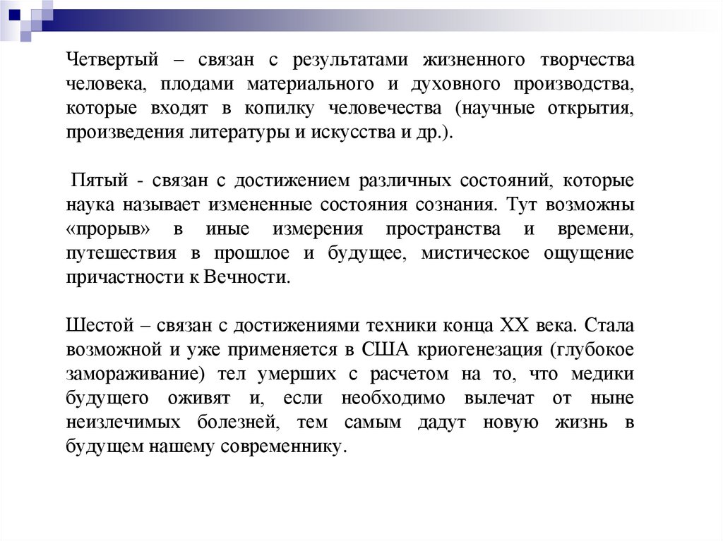 Четвертый – связан с результатами жизненного творчествачеловека, плодами материального и духовного производства,