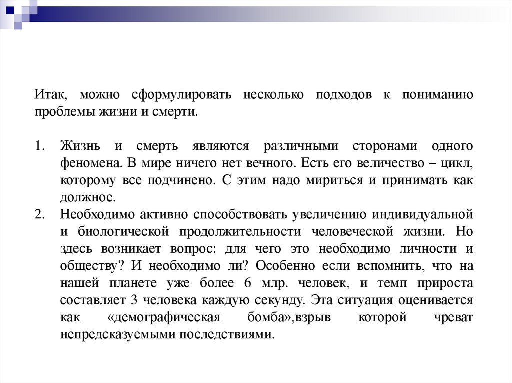 Итак, можно сформулировать несколько подходов к пониманиюпроблемы жизни и смерти.