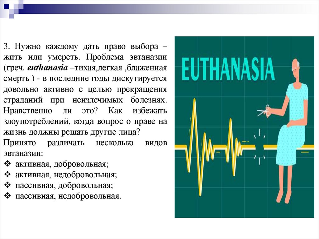 3. Нужно каждому дать право выбора –жить или умереть. Проблема эвтаназии