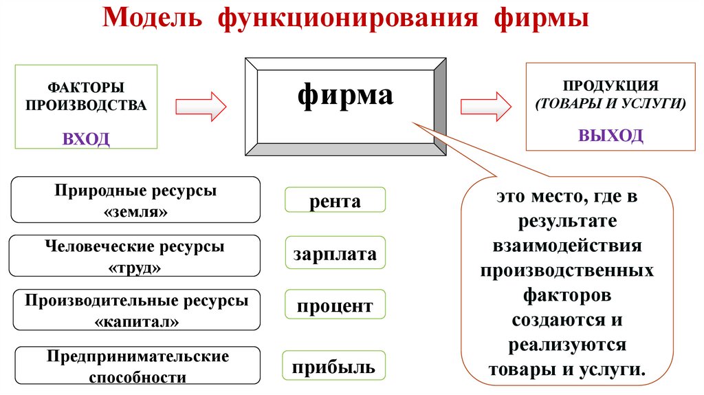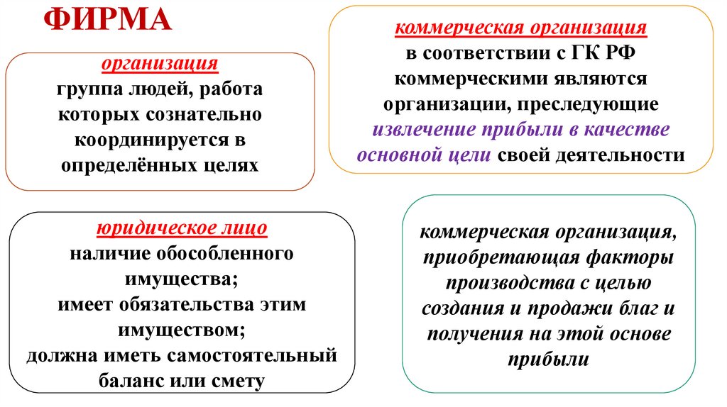 Фирма представляет собой коммерческую организацию, привлекающуюресурсы (факторы производства) с целью создания благ (товары, услуги,