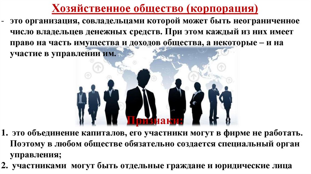 Хозяйственное общество (корпорация)- это организация, совладельцами которой может быть неограниченное
