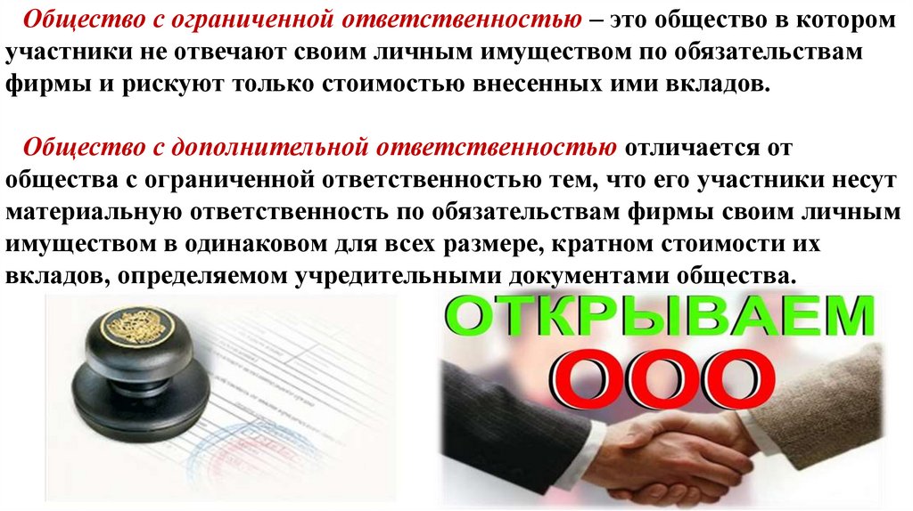 Общество с ограниченной ответственностью – это общество в которомучастники не отвечают своим личным имуществом по обязательствам